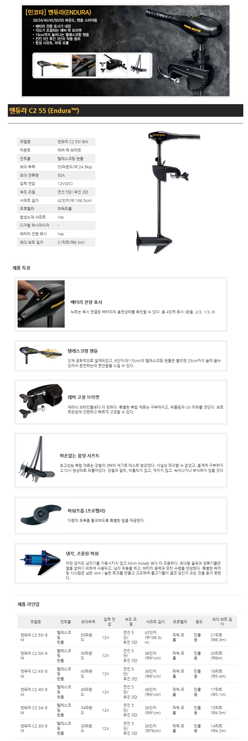 [엔듀라 C2 55/ BM] 배터리 잔량 표시, 55파운드, 42", 5/3 speed, 텔레스코핑 핸들, 12v