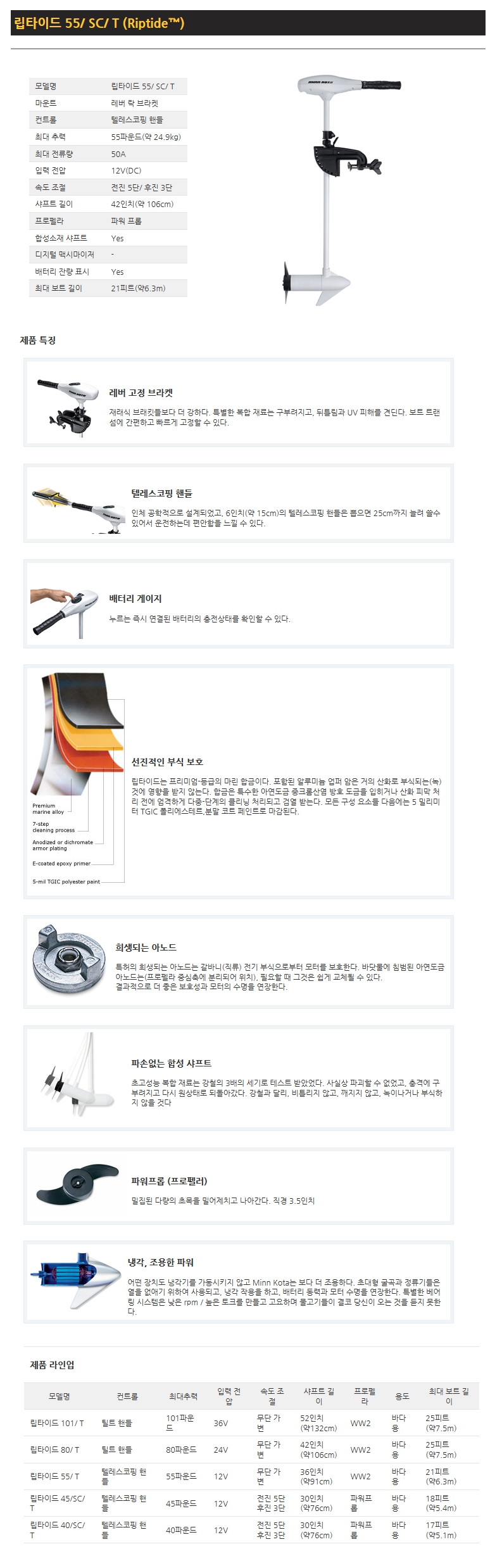 [립타이드 55/SC/T] 55파운드, 42", 전진 5단/후진 3단, 텔레스코핑 핸들, 바다(염수)용, 12v