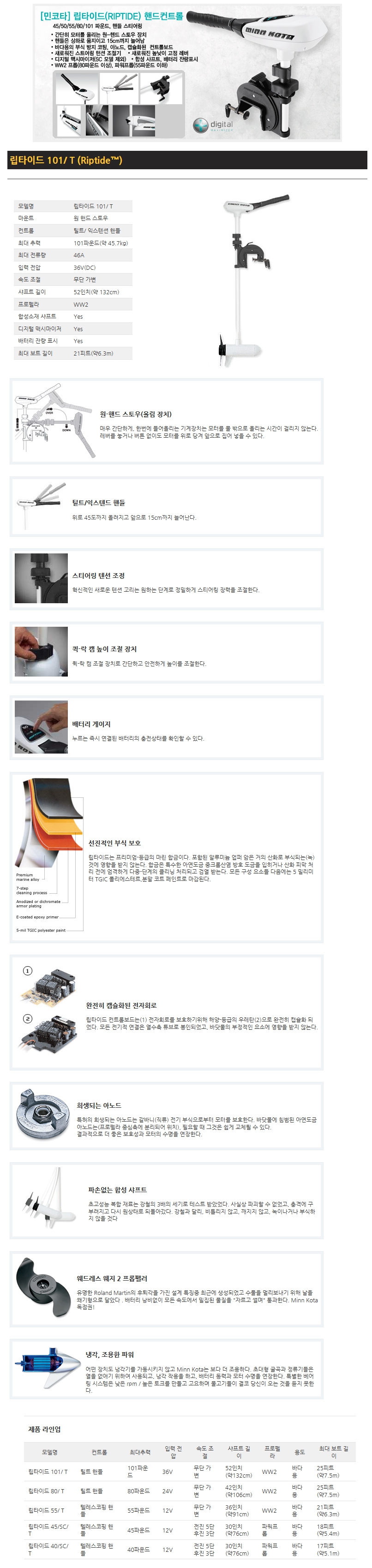 [립타이드 101/T] 101파운드, 52", 무단 가변, 틸트 익스텐드 핸들, 바다(염수)용, 24/36v
